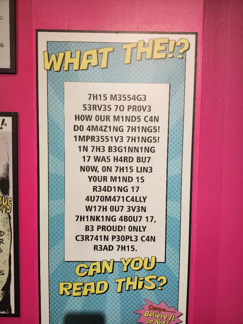 2. Ripley's is great for people of all ages, singles, couples, friend groups, and families. Unlike high-intensity rides or age-restricted activities, Ripley’s appeals to a broad range of ages. Young children will enjoy the visual oddities and interactive areas, while teens and adults can appreciate the strange trivia and unusual artifacts. I felt comfortable exploring it by myself. My two favorite areas was the mirror that changes your face, making you look completely different and the optical illusion pictured below.