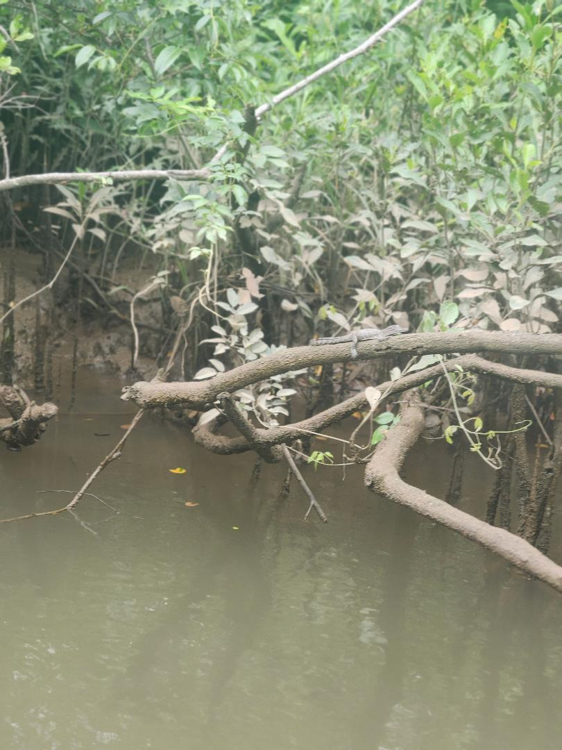 The baby crocodile is camouflaged with the branch. Look for the top branch in the second half of the picture. The baby crocodile is lying in the middle of the branch.